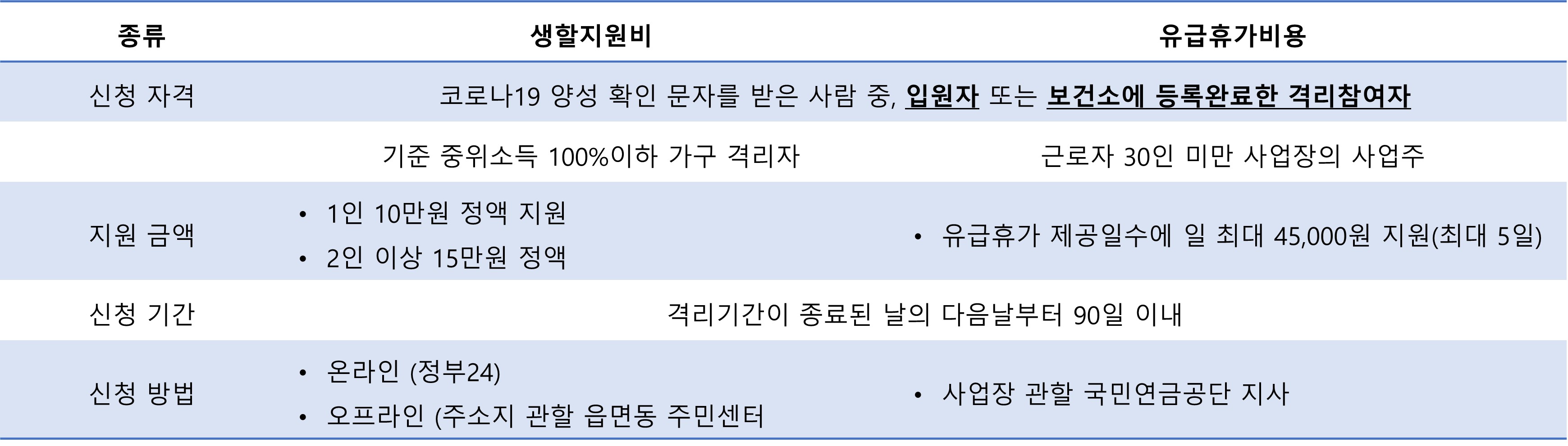 오늘은 코로나 19로 인해 입원을 하거나 격리 지원을 하고 성실 격리 이행을 한 사람에게 지원되는 생활지원(생활지원비 유급휴가비용)에 대해 알아보았습니다.